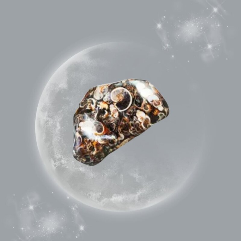 È una varietà di agata scura, bruna, quasi nera, piena di piccole spirali fossili: antiche conchiglie pietrificate. Ogni spirale è un “archivio”: di passaggi, radici, viaggi, generazioni.