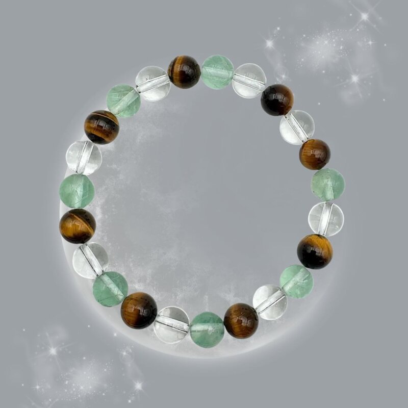 Il bracciale Mente Chiara combina la forza dell’Occhio di Tigre, la lucidità della Fluorite e la purezza del Cristallo di Rocca, creando una sinergia perfetta di energia, concentrazione e fiducia.